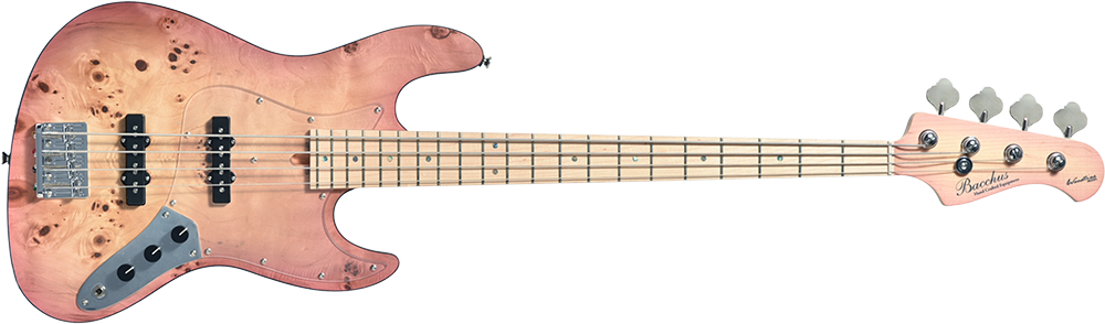 本モデルは過去にBacchus Handmade Seriesから限定モデルで登場した、KRB(渓流ブルー)とSYP(ソメイヨシノピンク)のカラーリングを踏襲した淡い色合いで仕上げています。薄い色のバーストは技術を要しますが、国産モデルを製造している飛鳥工場の職人の熟練した塗装技術を再現。メイプルの指板を含めてベース全体の外観を柔らかな雰囲気でまとめました。