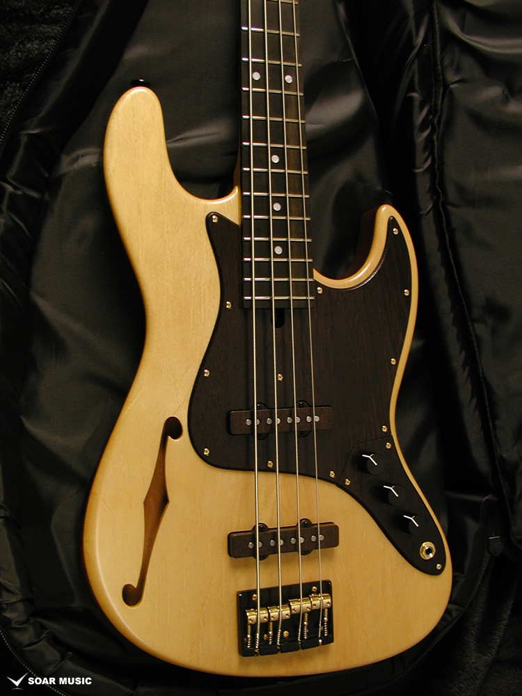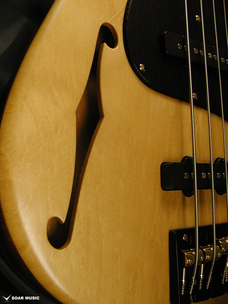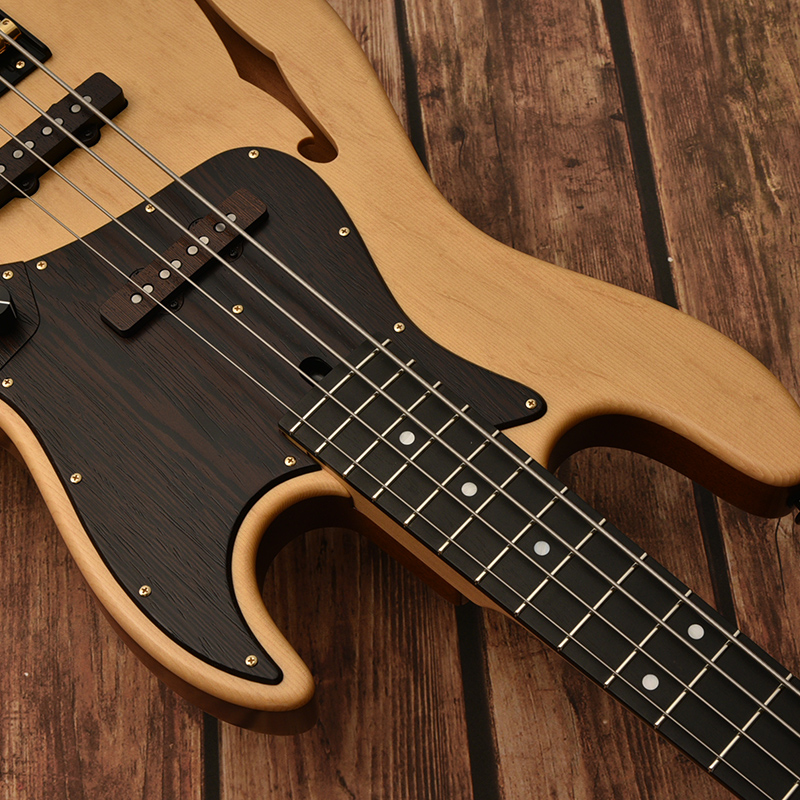 ボディに空洞部分を作り、Fホールを設けたことでジャジーなルックスとなるだけでなく、アコースティックライクな材との組み合わせによりサウンドにエアー感が生まれます。また、ボディも軽量になるため演奏ストレスの軽減にもなります。