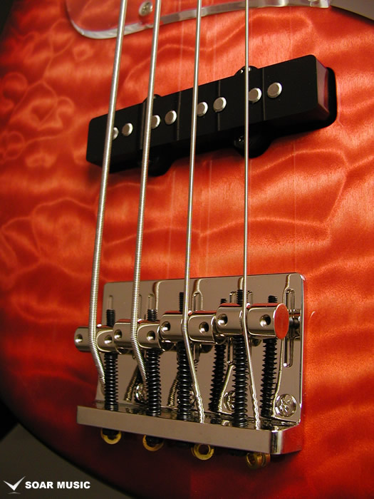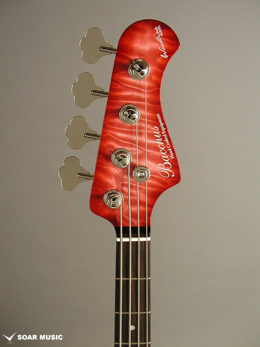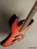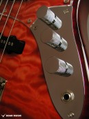 通常のジャズベースと同じ2ボリューム、1トーン仕様ですが、ターボスイッチが搭載されており、トーンノブをプルアップする事でターボ回路がONになり、ややボリュームが上がり、より中低音域が強調された力強いサウンドを出力します。ターボ回路の仕組みにつきましては、通常、「パラレル(並列)回路」で配線されているフロント/リアピックアップをターボONで「シリーズ(直列)回路」に切り替える事で独立していたフロント/リアピックアップが一体となり、流れる信号の量が増す事でパワフルなサウンドへと変化します。