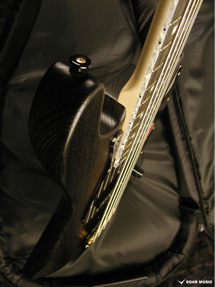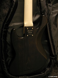 材の質感、木目を活かしたブラックオイルフィニッシュに、ブラック&ゴールドパッケージのハードウェアに合わせて、シースルースモークブラウンカラーのピックガードを搭載。
