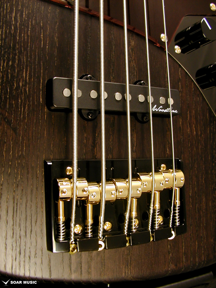 ブリッジにはブラックカラーのベースプレートとゴールドカラーのサドルを組合わせた同社製5弦仕様の404SJ-5Bを搭載。