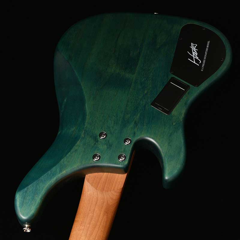 さらに演奏中の電池切れへの対処や出力の調整などを考慮したプリアンプ ON/OFFスイッチ、リハーサル中の休憩など日常使用時にも重宝するキルスイッチ、シールド抜けなどのトラブルを軽減するボディトップのアウトプットジャックなど実用性を追求しました。こちらもヘッドレスのシグネチャーベースから継承された仕様です。