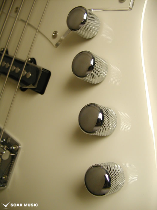 クリアピックガード搭載の他、コントロールパネルを廃し、コントロールノブをダイレクトにマウントしたモダンなルックスに仕上げています。
