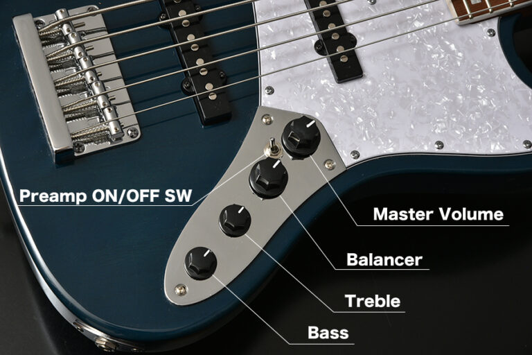 本モデルはアクティブ仕様で、Volume、Balancer、Treble、Bassのレイアウトとなっており、幅広い音作りが出来ます。 使い方としては、Balancerでフロントピックアップとリアピックアップの出力のバランスを決め、Treble、Bassの2バンドEQで音の太さや抜け感といった音のバランスを変え、Volumeで最終的な音の大きさをセッティングし、バンドアンサンブルの中でのベースの出音を手元で設定します。 また、ボリュームノブとバランサーの間にプリアンプのON/OFFスイッチも搭載されているため、足元などで音作りがしたい方でも問題なくご使用いただけます。