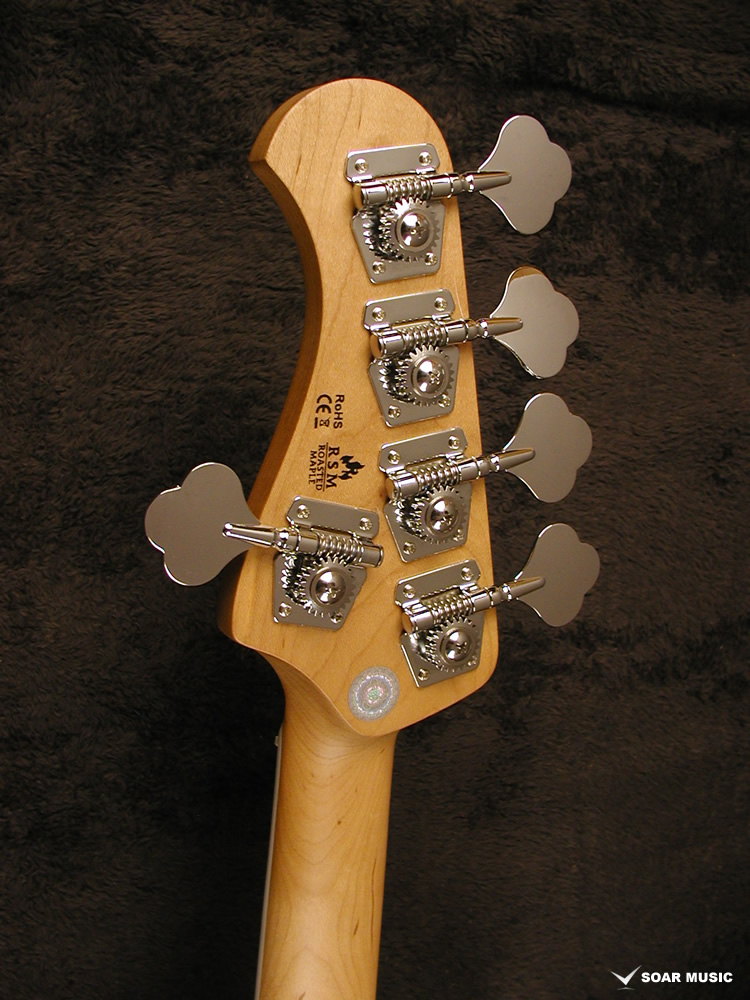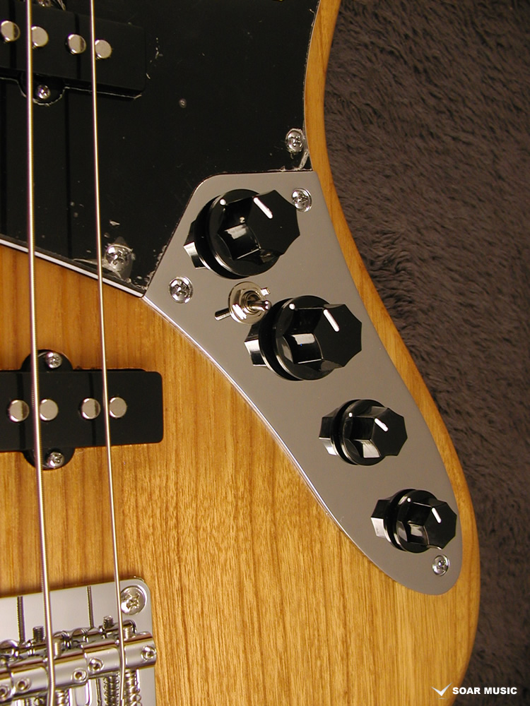 本モデルはアクティブ仕様で、Volume、Balancer、Treble、Bassのレイアウトとなっており、幅広い音作りが出来ます。 使い方としては、Balancerでフロントピックアップとリアピックアップの出力のバランスを決め、Treble、Bassの2バンドEQで音の太さや抜け感といった音のバランスを変え、Volumeで最終的な音の大きさをセッティングし、バンドアンサンブルの中でのベースの出音を手元で設定します。 また、ボリュームノブとバランサーの間にプリアンプのON/OFFスイッチも搭載されているため、足元などで音作りがしたい方でも問題なくご使用いただけます。