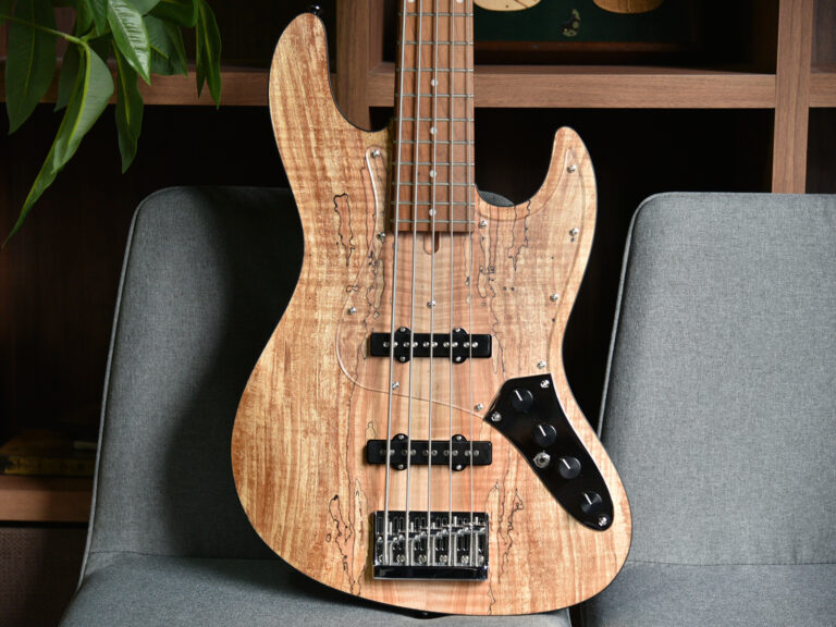 本機最大の特徴は、トップ材に使用される「スポルテッドメイプル」になります。「スポルテッド(Spalted)」とは、自然の中で細菌などによって木材の腐朽(ふきゅう)が進んだ結果、特徴的な模様を持つ杢目が生まれた木材に使用される言葉です。工芸品の装飾に使われることも多く、王道のフレイムやキルト杢とは一味違った雰囲気を感じさせます。