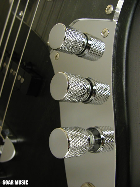 通常の2ピックアップタイプのベースはフロントピックアップ、 リアのピックアップをパラレル(並列)で配線してますが、 WOOD LINE ASH はターボスイッチを搭載しており、 トーンノブを引っ張るとフロント/リアピックアップを連動させたシリーズ(直列)回路に 切り替わり、出力がアップします。 ターボON (シリーズ)時はフロント/リアピックアップが 連動し、ハムバッキングタイプの ピックアップになり、フロントピックアップの ボリュームノブで音量調節が可能になります。