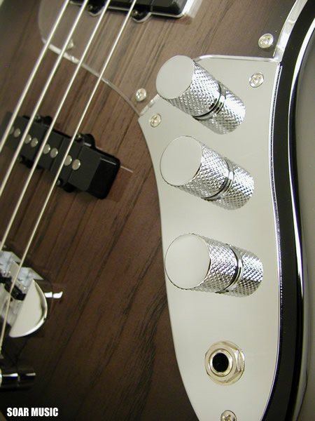 通常の2ピックアップタイプのベースはフロントピックアップ、 リアのピックアップをパラレル(並列)で配線してますが、 WOOD LINE ASH はターボスイッチを搭載しており、 トーンノブを引っ張るとフロント/リアピックアップを連動させたシリーズ(直列)回路に 切り替わり、出力がアップします。 ターボON (シリーズ)時はフロント/リアピックアップが 連動し、ハムバッキングタイプの ピックアップになり、フロントピックアップの ボリュームノブで音量調節が可能になります。