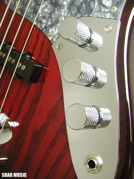 通常の2ピックアップタイプのベースはフロントピックアップ、 リアのピックアップをパラレル(並列)で配線してますが、 WOOD LINE ASH はターボスイッチを搭載しており、 トーンノブを引っ張るとフロント/リアピックアップを連動させたシリーズ(直列)回路に 切り替わり、出力がアップします。 ターボON (シリーズ)時はフロント/リアピックアップが 連動し、ハムバッキングタイプの ピックアップになり、フロントピックアップの ボリュームノブで音量調節が可能になります。