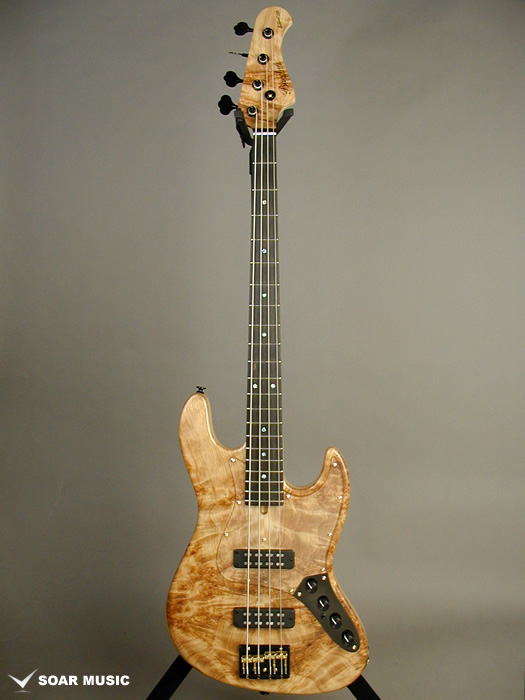 ハンドメイドシリーズのWOODLINE DX4 ACモデルを基に、エキゾチックウッドをボディトップに使用し、フロント/リアにオリジナルデュアルコイルピックアップを搭載した、特別仕様のカスタムモデルのご紹介です。ボディトップに配されたレアで独特な木目の桜バール材が力強い存在感を放っています。アクティブ仕様でプリアンプには2バンドEQのAguilar(アギュラー)OBP-2を搭載。更にハムピックアップによりパワフルで重厚感のある低音域ですが、ブーミー過ぎ、まとまったサウンドとなっています。ゴールド&ブラックカラーのハードウェアにより、精悍で落ち着きのあるルックスも魅力です。