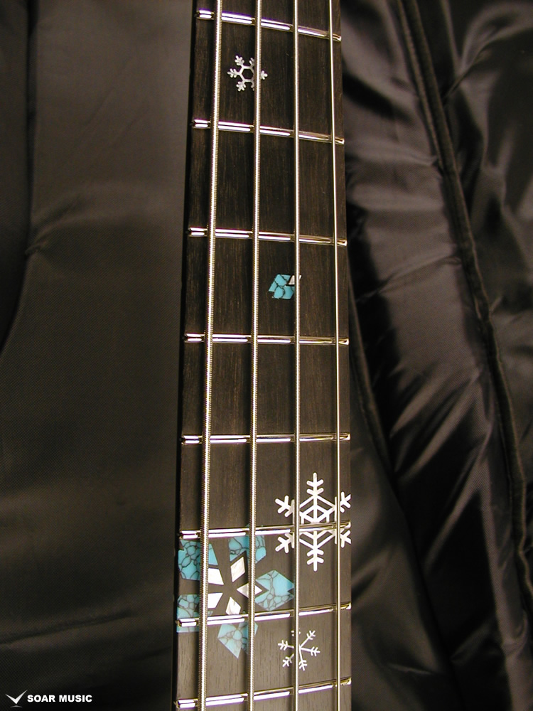 指板には雪の結晶とともに舞い落ちる冬桜の姿をインレイによって表現しました。ヘッドストックには冬空に浮かぶ三日月がプリントされ、白銀の世界を照らし出します。