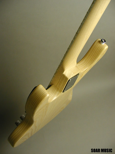 バッカスオリジナルのオイルフィニッシュによるアッシュ材の質感に、レザーのピックガードが良い雰囲気で馴染みます。