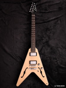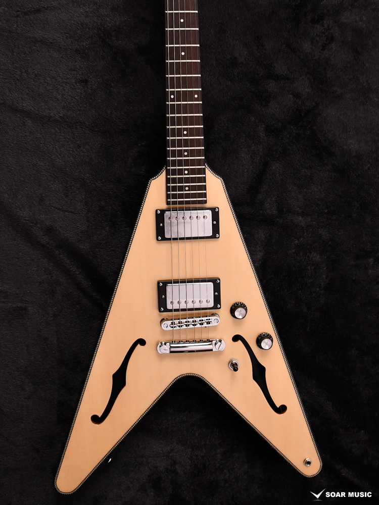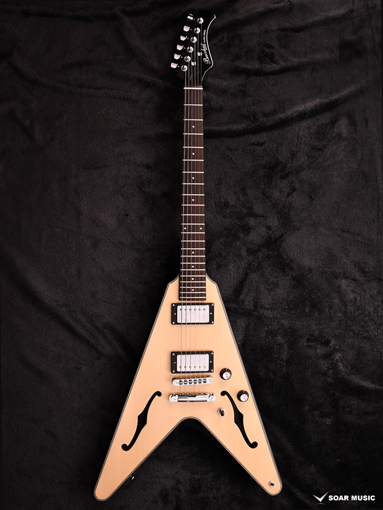 Fホールを有するセミホロウボディを採用した「BFV-JAZZ」。ボディのトップにはアコースティックギターでは定番のトップ材であるスプルースを使用。ナト―材のボディを可能な限り大きく掘り込むことによってボディ内部に広い空間が生まれ、そこから生まれる豊かなアコースティック・トーンが最大の魅力です。