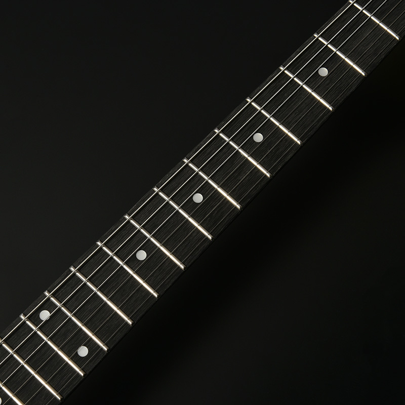 指板には黒染めしたパープルハート(Staind Purpleheart)を使用。 パープルハートは、本来ほんのりと紫がかった見た目が特徴の木材ですが、黒染めをしてエボニーのような高級感を演出しました。 材質としては非常に硬く、ローズウッドよりもやや高音にピークを持ったブライトなサウンドを得意とします。