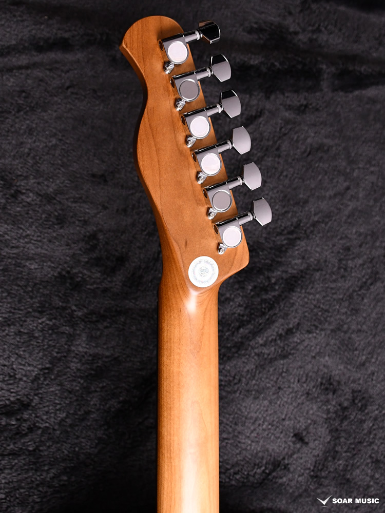 ローステッドメイプルとはメイプルを高温で加熱処理して材の中の水分や油分を揮発させることにより木材を経年変化した状態に人工的に近づけた材のことです。経年変化が進んだ材は歪みやねじれが生じにくくなります。ネックに使用されるとその効果は安定性だけでなくサウンドにも及び、豊かな生鳴りと経年変化したビンテージのようなこなれたトーンを生み出します。一般的に高級機種などで用いられる材ですが、手に取りやすい価格帯に落とし込むことに成功しました。