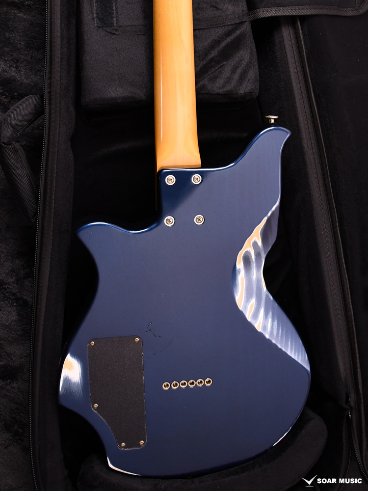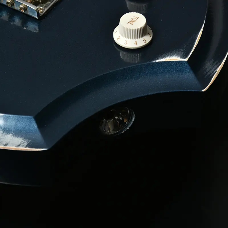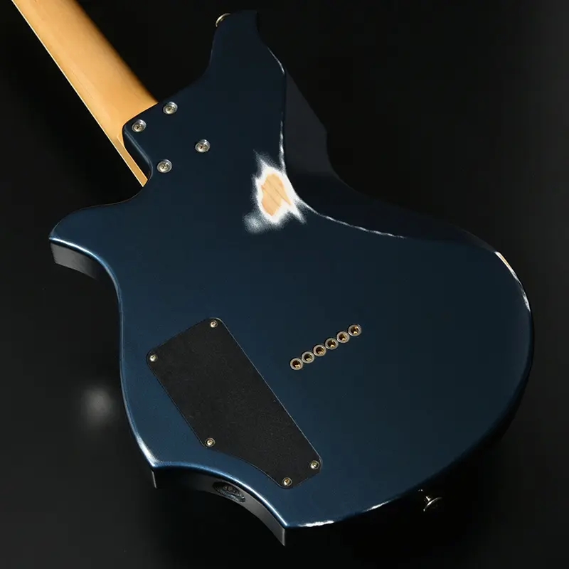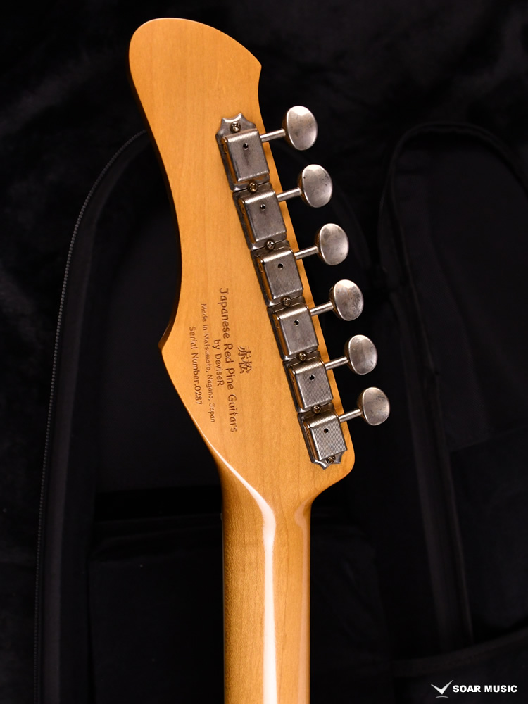 赤松の持つ節やシミを個性として捉え、全体的なデザインに馴染むようボディとヘッドストック、そして金属パーツにエイジド加工を施しています。