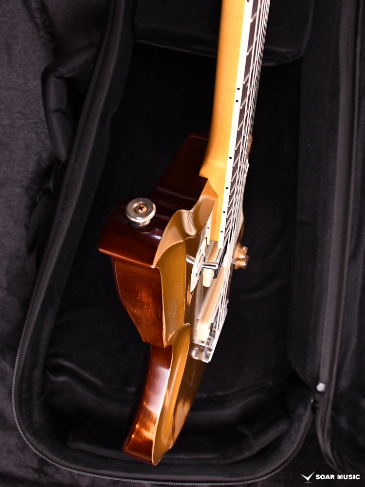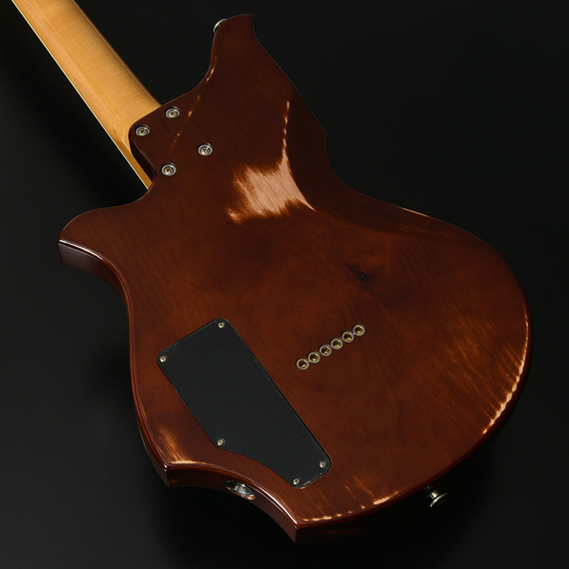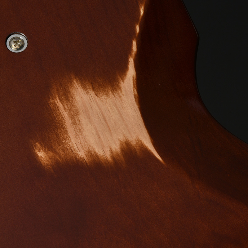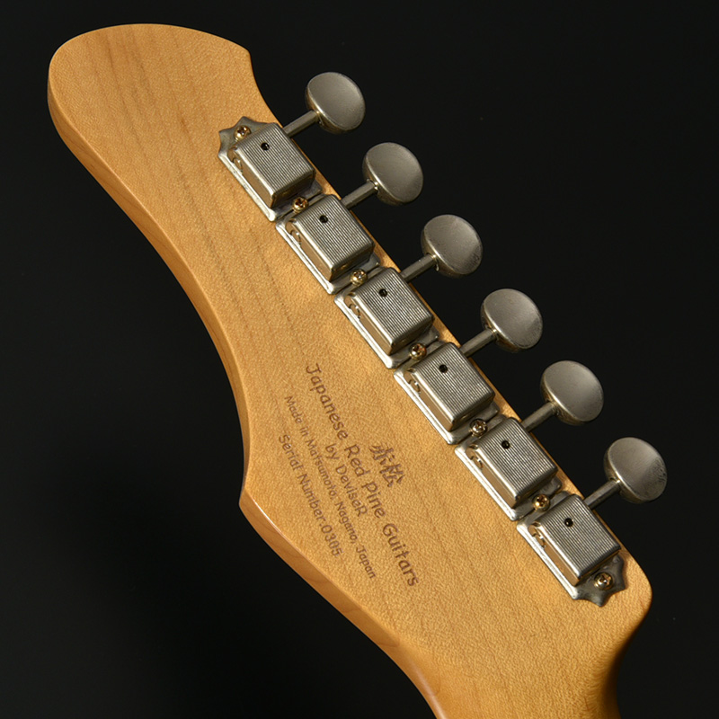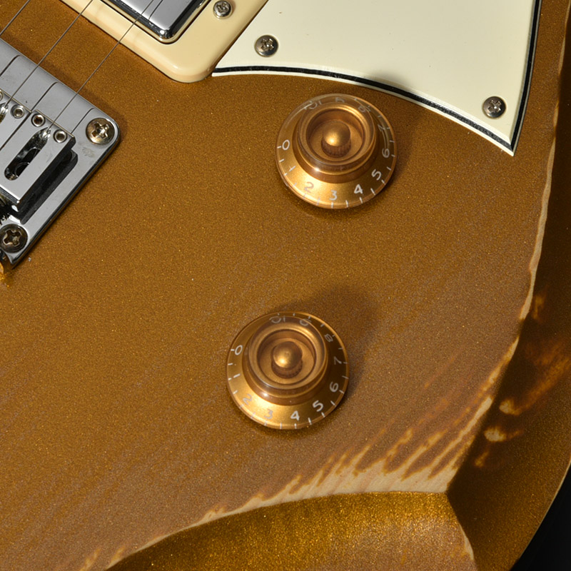 赤松の持つ節やシミなどをデザインへと昇華する、エイジド加工がボディとパーツに施されています。特別カラーとして、ビンテージ・ギターにインスパイアされたGold Topカラー、そしてブラックにフィニッシュされたヘッドストックが印象的な一本です。