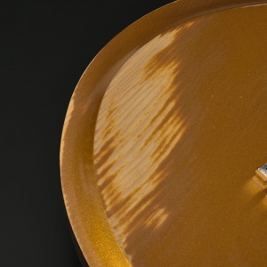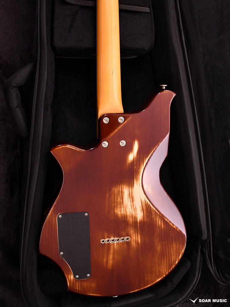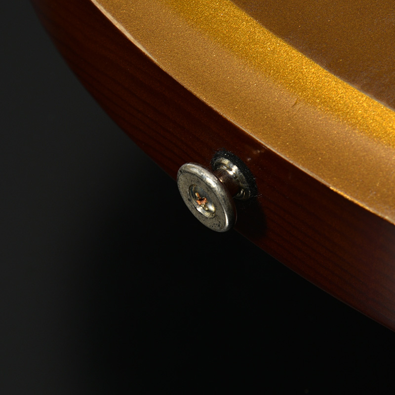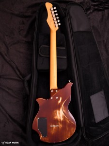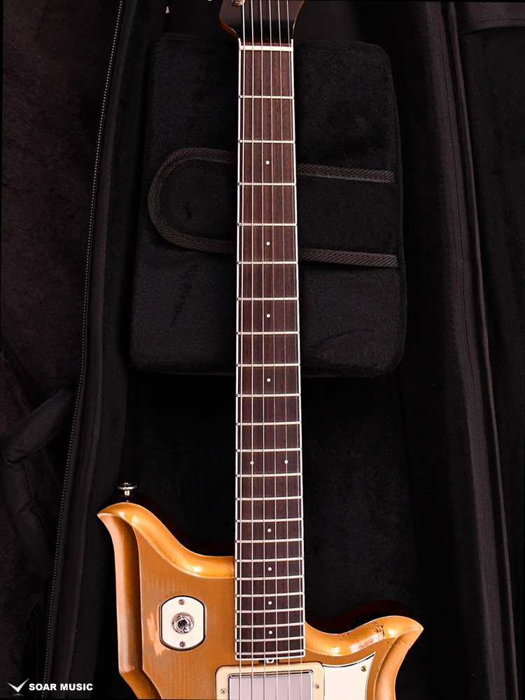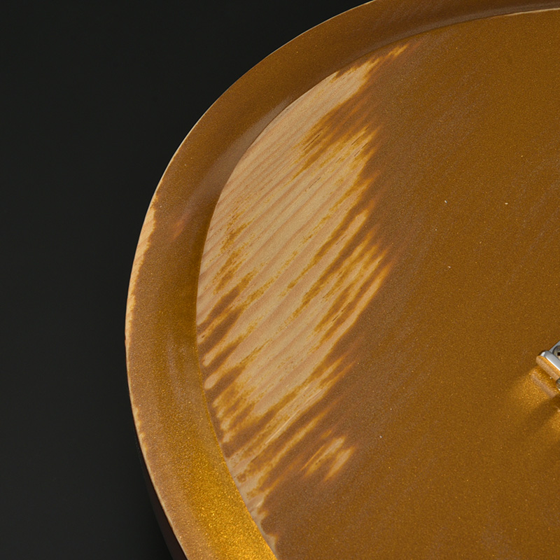 赤松の持つ節やシミなどをデザインへと昇華する、エイジド加工がボディとパーツに施されています。特別カラーとして、ビンテージ・ギターにインスパイアされたGold Topカラー、そしてブラックにフィニッシュされたヘッドストックが印象的な一本です。
