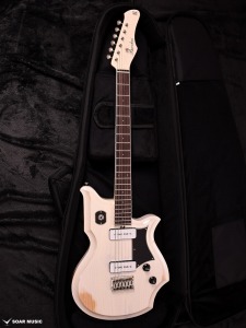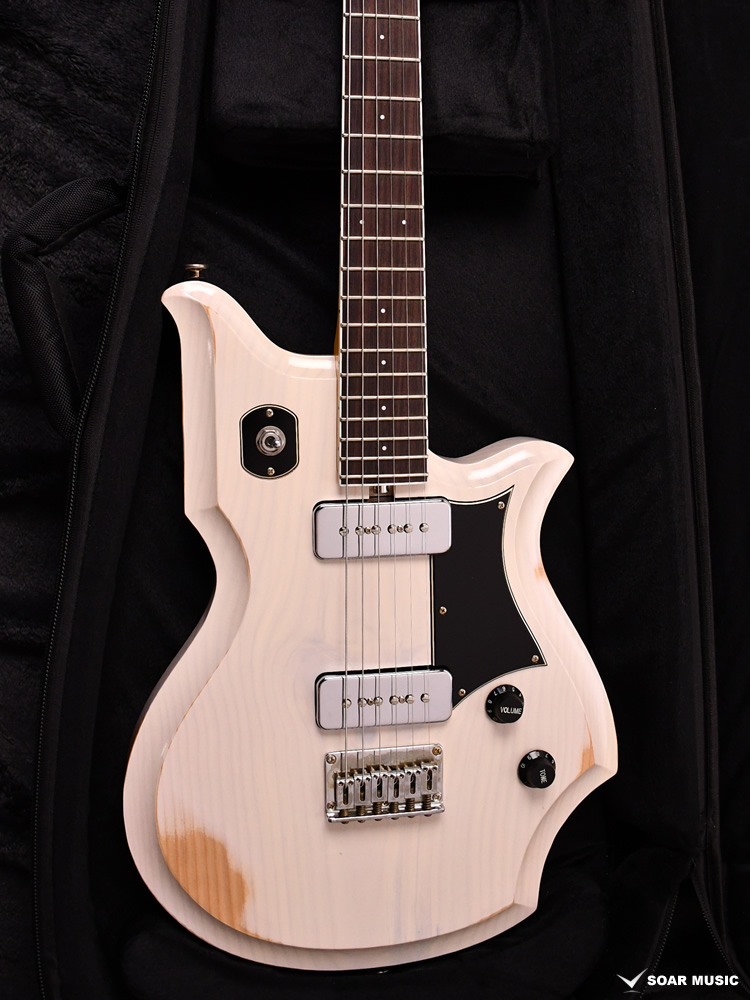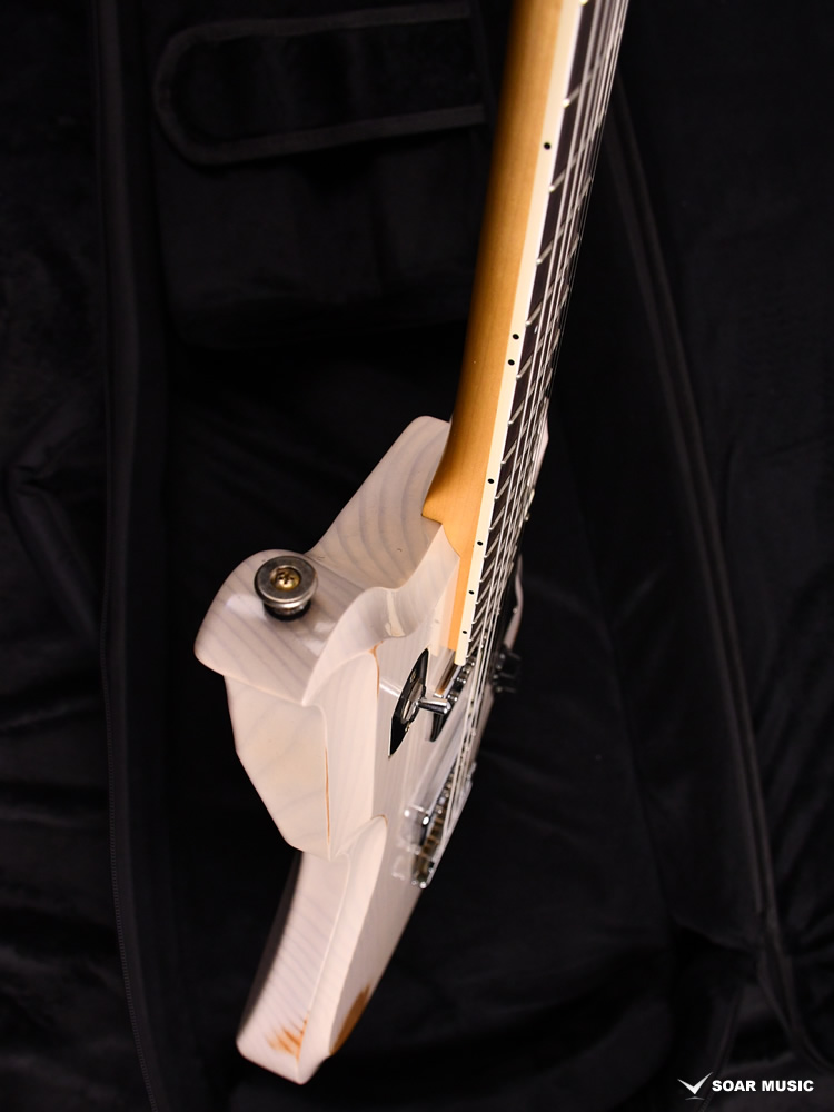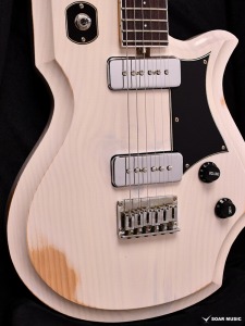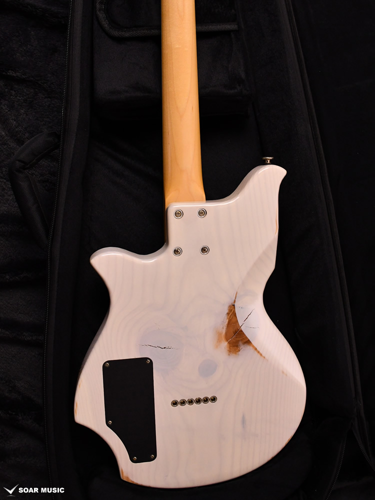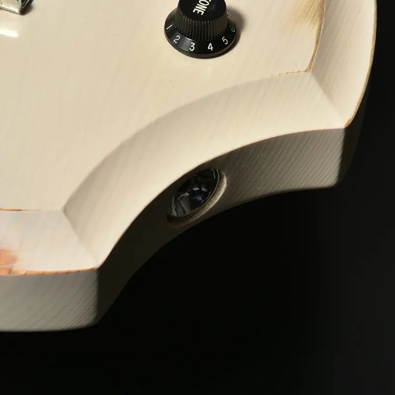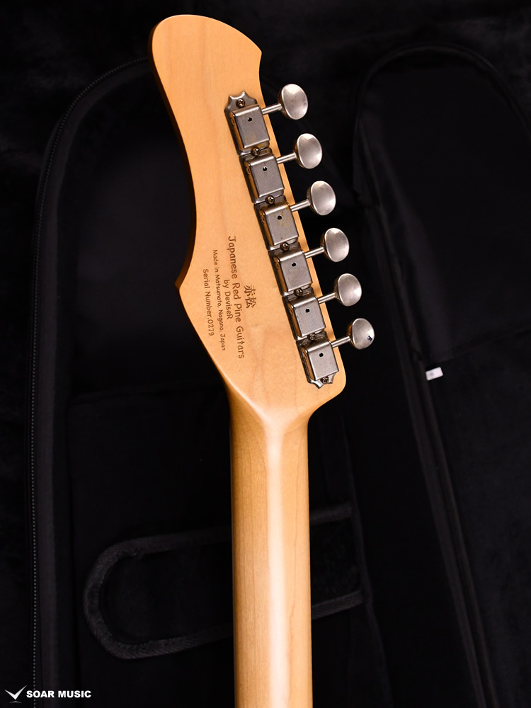 赤松の持つ節やシミを個性として捉え、全体的なデザインに馴染むようボディとヘッドストック、そして金属パーツにエイジド加工を施しています。