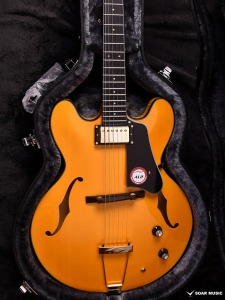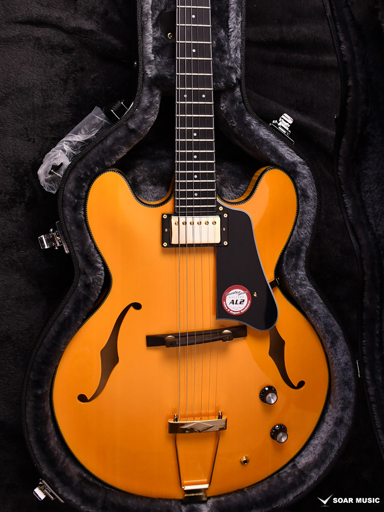アコースティックギターの材料としてよく知られる、スプルースをボディトップに採用。フルホロウボディとの組み合わせで、薄同タイプでありながら豊かな生鳴りを実現しています。またセンターブロックを廃したことにより、本体重量も非常に軽量に。ボディのサイド&バックには杢目の鮮やかなフレイムメイプルを使用しており、ステージでも目を引く仕上がりです。