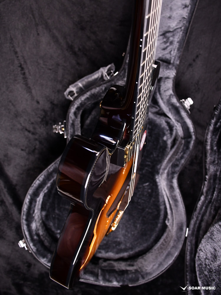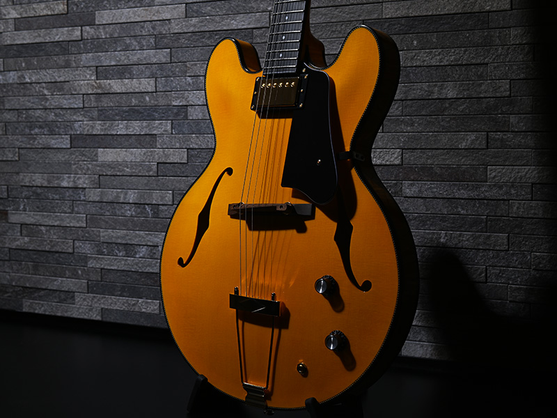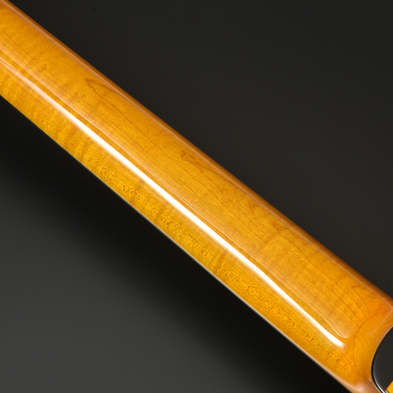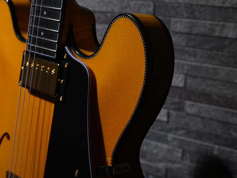アコースティックギターの材料としてよく知られる、スプルースをボディトップに採用。フルホロウボディとの組み合わせで、薄同タイプでありながら豊かな生鳴りを実現しています。またセンターブロックを廃したことにより、本体重量も非常に軽量に。ボディのサイド&バックには杢目の鮮やかなフレイムメイプルを使用しており、ステージでも目を引く仕上がりです。