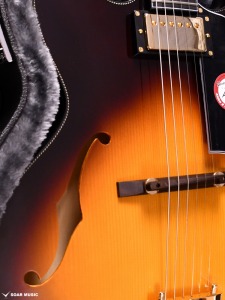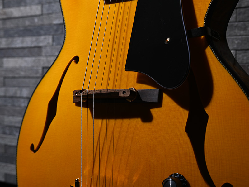 フルアコースティック仕様にともない、アーチトップに合わせて作られたオバンコール材のブリッジを装備。金属製のものに比べて、深みのある温かいサウンドが特徴です。