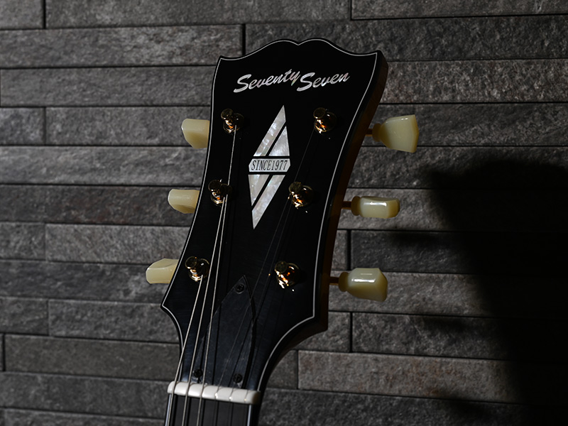 ボディにはアコースティックギターを思わせるヘリンボーンのパーフリングを装飾。ヘッドにはSeventy Sevenのトレードマークである”77″を模ったインレイが施されています。