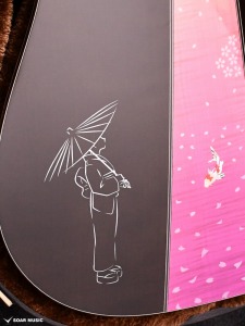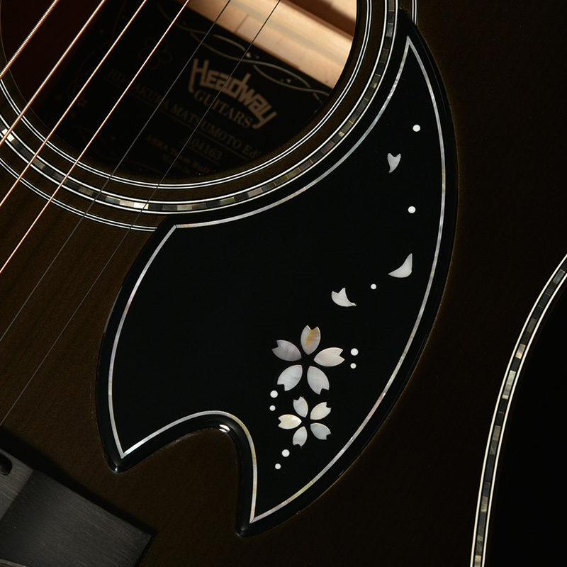 桜ギター一番の特色であるボディサイド・バックの桜材は特有の中音域に特徴のある私達が”桜サウンド”と表現する音色を聞かせます。さらにボディバックセンターに同じく和材のカエデ材を使用し、松本城のお掘をイメージした、四季と優雅に泳ぐ鯉をデザインしています。