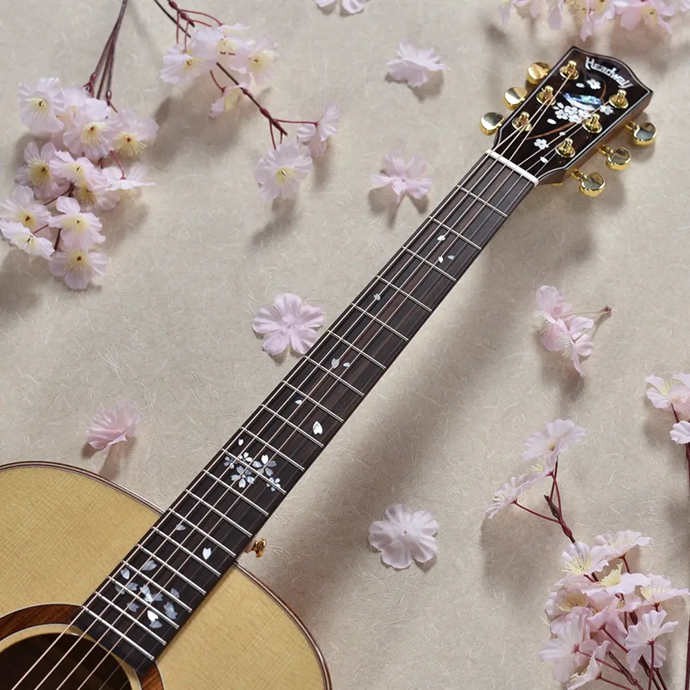 一方で、ヘッドと指板には白蝶貝やアバロンを用いて華やかな装飾を施しました。ヘッドに咲き誇る満開の桜から、桜の幹に見立てた指板上へと花びらが「零れ落ちていく」様子を白蝶貝で描き、おさむらいさんが思い描く桜の情景を表現しています。