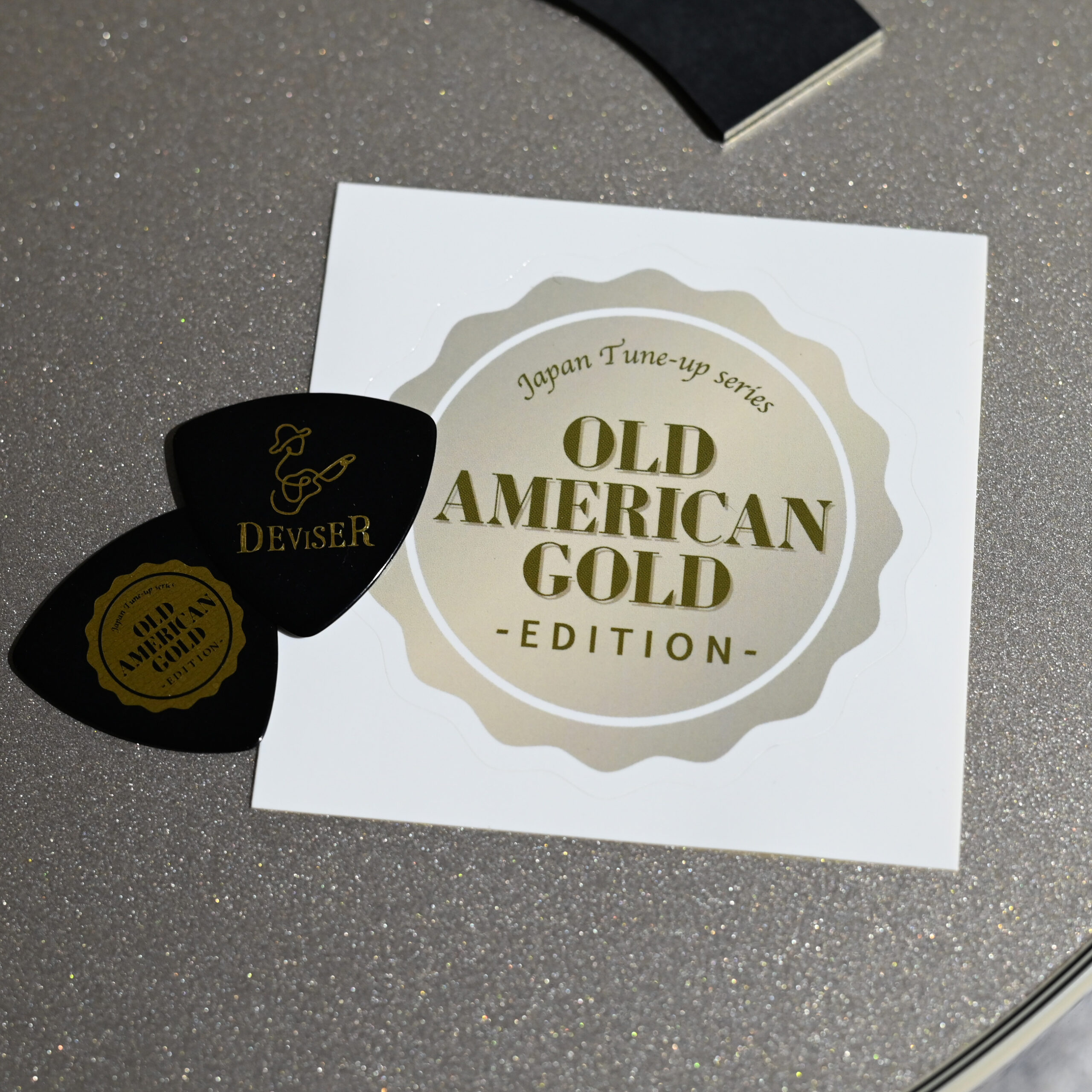 購入特典として、「OLD AMERICAN GOLD」ロゴ入りのオリジナルピック×2枚とステッカーが付属。