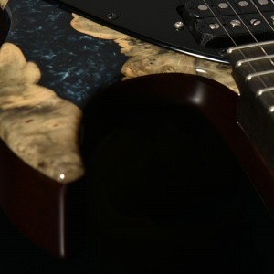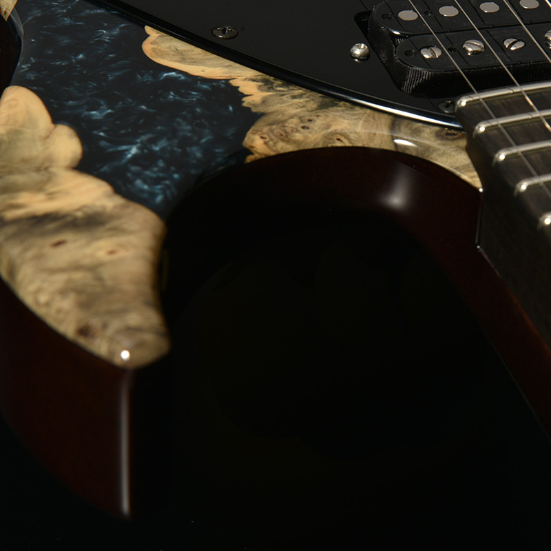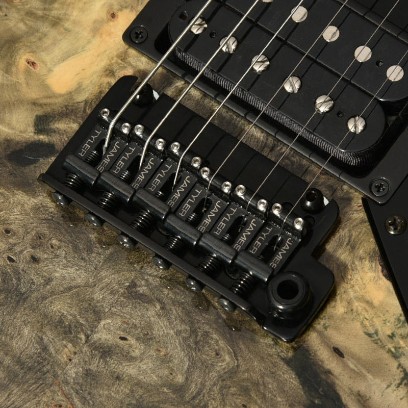 フレイム杢の現れたメイプルのネックは反りやねじれに強い「柾目(まさめ)」で製材されており、安定感抜群の演奏性と末長くご愛用いただける仕様を実現。ネックグリップはJames Tyler氏の好んだグリップ形状を踏襲しています。