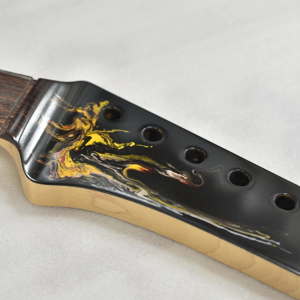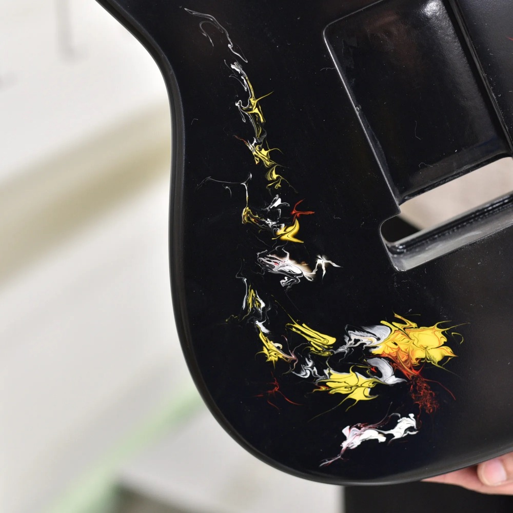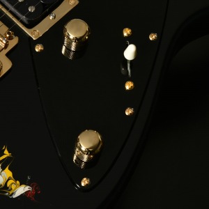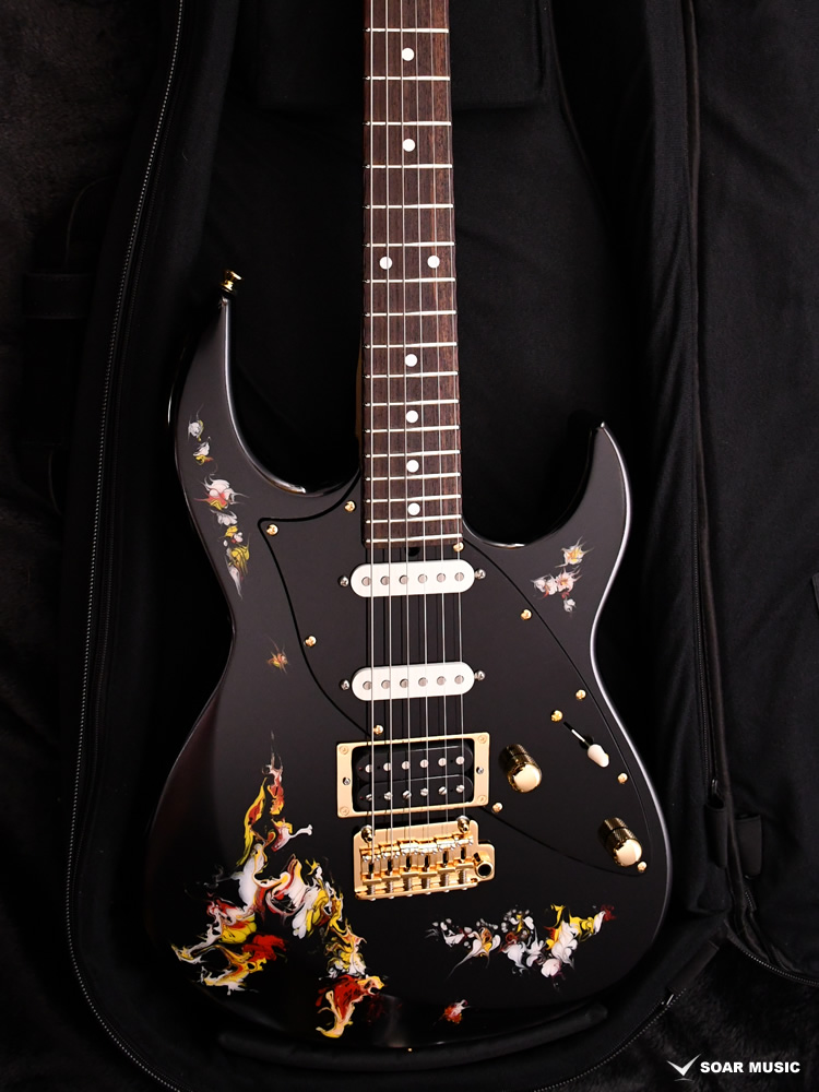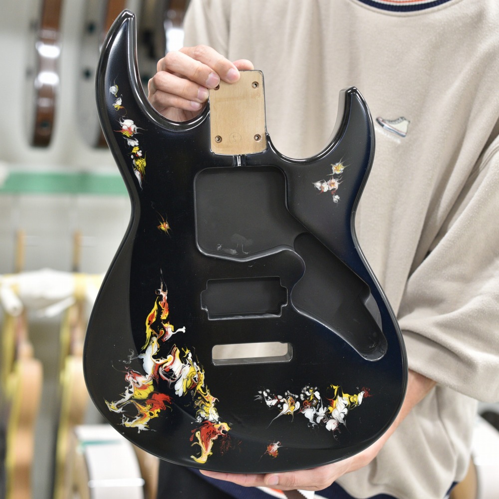 水中に絵の具を垂らした瞬間に広がる流線模様で描く「フルイドアート」と呼ばれる技法に着想を得て、飛鳥の塗装職人が独自の手法で仕上げた一本。フルイドアートの技法を応用し、日本画を想起させるような繊細な線や筆の運びをイメージ。ボディトップのコンター部分には暗闇の中で燃えさかる炎にも似た印象のデザインとなり、唯一無二の1本として完成しました。ボディバックとヘッドトップにも同様の塗装が施され、実機全体にこの流線による繊細な意匠が広がります。