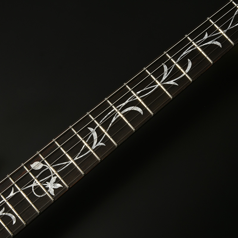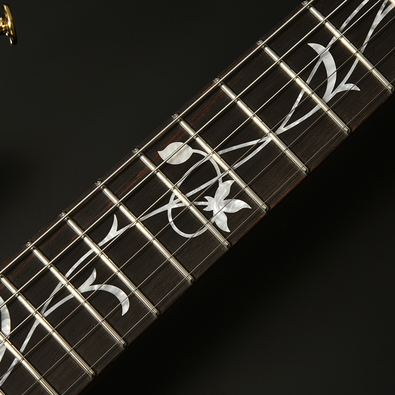 現在最も入手困難な木材のひとつブラジリアンローズウッド(ハカランダ)を指板とピックアップエスカッションに使用しています。指板上にはフラワーインレイが施され、その唯一無二の美しさをさらに際立てています。