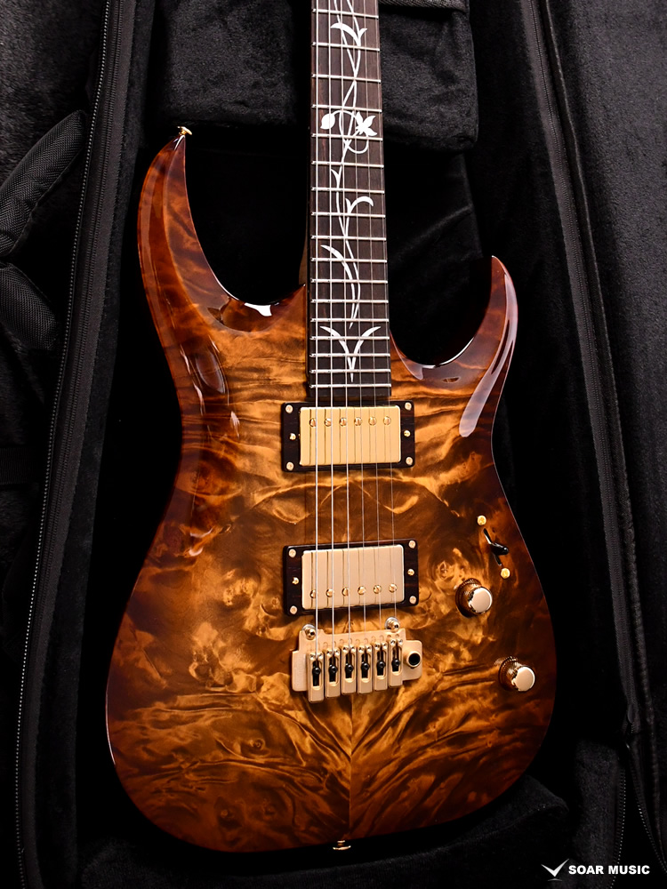 ボディトップ、バックそれぞれに最高グレードのフレイムトチを使用し、その杢目を最大限に生かした美しいバーストカラーが施されています。バック材にもトチが用いられていることにより、サウンド面でもその持ち味が発揮され、特徴的な中〜高音域にかけて広がる抜けの良いトーンを存分に感じることができます。