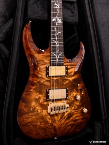 アーチトップが特徴的な新シェイプ”MA” (Momose Advanced)に、極上の和材フレイムトチを採用した特別な一本が登場。その見た目のみならず、H-H配列のピックアップ、2点支持トレモロ、24F仕様、ジョイント部分のヒールレスカット、そしてコイルタップ機能と言った現代のミュージックシーンを意識した仕様を数多く取り入れたモダンスタイルが特徴です。