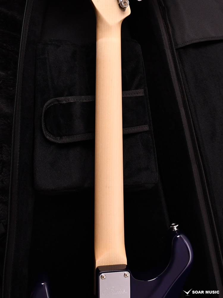 ピックガードには特注で製作しているダークブルーパールのアクリル素材をセレクトしており、ボディカラーとのマッチングで洗練された印象を与えます。