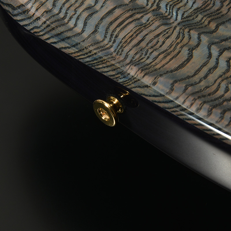 和材として知られる「タモ」の中でも、縦にひだ状の杢目を有す個体をキルトタモと称します。その独特の模様は着色されることでいっそう魅力を増し、インパクト抜群の個性的なルックスへと仕上がりました。