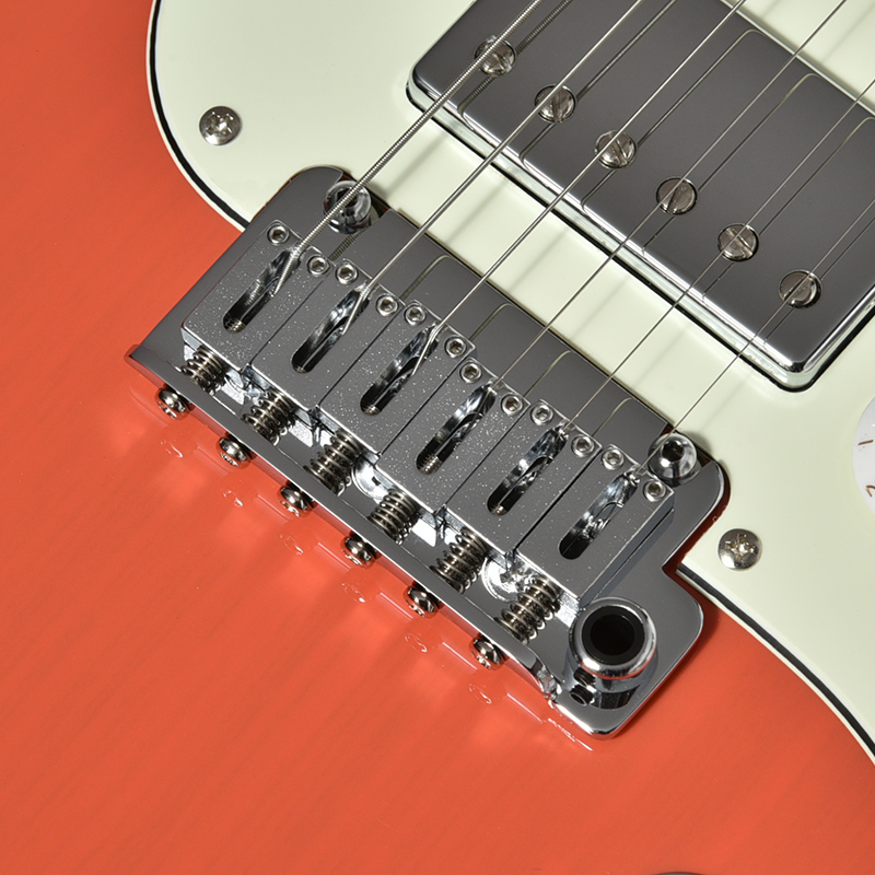 ブリッジには信頼のGOTOH製2点支持トレモロユニットを搭載しています。 “510T”シリーズは、従来のヴィンテージスタイルにはこだわらず、トレモロ装置としての機能を追求しました。クリアランスの少ない独自のアームシステムを搭載。可動の支点となるエッジ部の強度と耐摩耗性を確保する為、プレートには高硬度のクロームモリブデン鋼を採用。精密な加工とハイレベルな熱処理で仕上げました。支点部はスタッドロック(PAT.)を採用した2点支持アンカーナットタイプです。またサドルとボールエンド間で弦のプレートへの干渉を避ける為に独自の形状に成型されたFST機構(PAT.)を持つブロックを装備した事で、アーミング後のチューニングの復元性を飛躍的に向上させました。