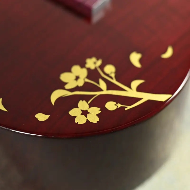 ボディにあしらわれた金箔の桜が映えるよう、濃いグラデーションカラーで仕上げました。 ヘッドトップにも桜材を用いており、ボディ同色のマッチングヘッド仕様に仕立てることで上品な高級感を纏った1本です。