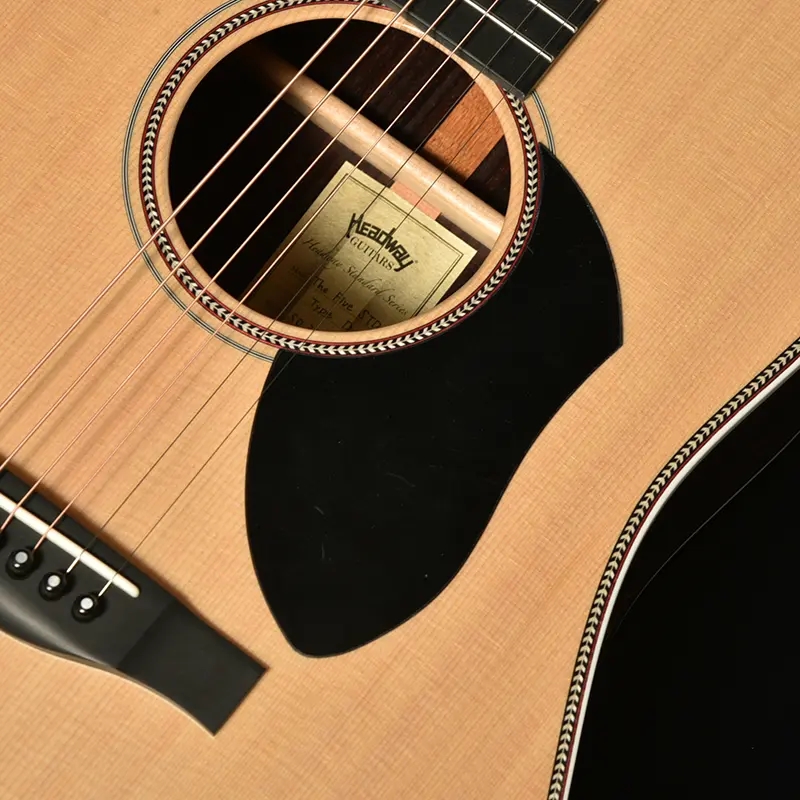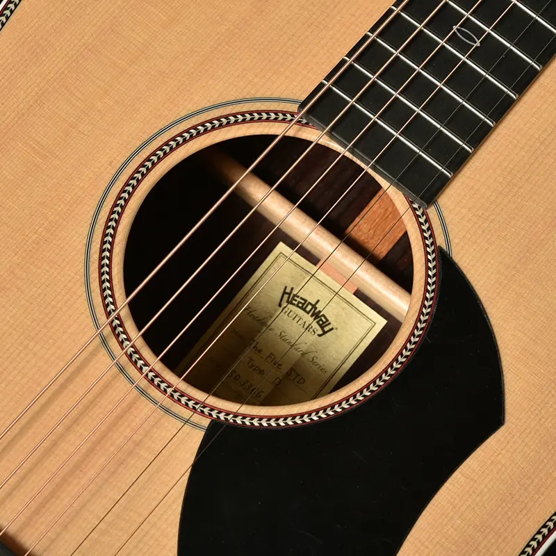 531、523などの品番に代表されるロングセラーモデルを生み出し、Headwayの定番として長年親しまれてきた500シリーズ。そのサウンドの要となるブレーシングパターンなど基本的な構造はそのままに、現代のプレイヤーにとっての弾きやすさを追求したリニューアルモデルが誕生しました。 最大の変更点はそのナット幅。従来の43mmから43.5mmに変更することで、握り込んだ時のグリップはもちろん、フィンガースタイルのプレイヤーにも最適な演奏性を確保しました。 デザイン面でも500シリーズの持つ特徴をより現代的に発展させ、新しくデザインされたピックガードとヘッドのイーグルインレイを採用。指板のポジションマークには、マスタービルダーの百瀬恭夫が愛用していた特徴的な形状を取り入れています。