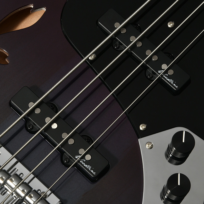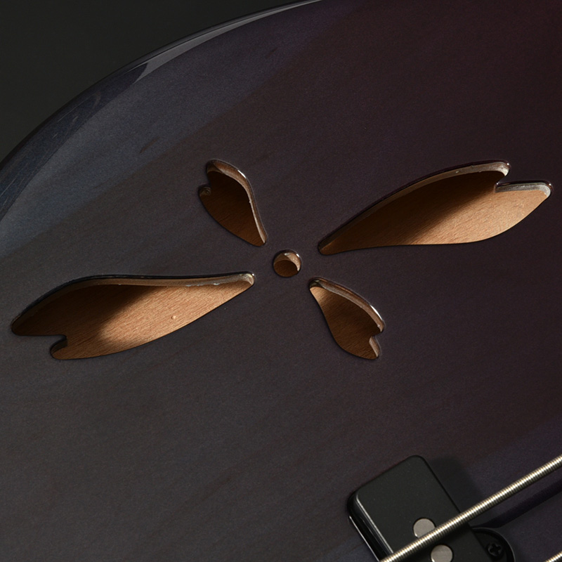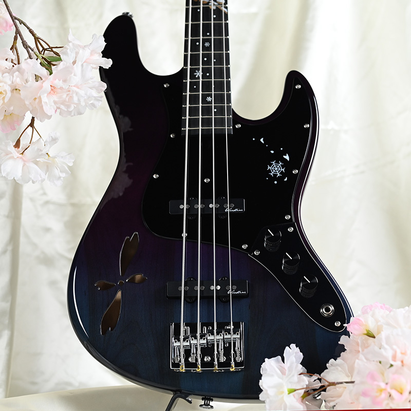 本モデルのボディトップには桜材を使用し、その繊細な木肌を引き立てるように、冬の夜空を思わせる深いブルーから紫へと移ろうグラデーションで仕上げました。十分な硬質さを持つ桜材とボディバックに用いられる定番のアルダー材により、桜材特有の煌びやかなニュアンスを備えつつも、ジャンルを選ばない幅広い音作りを可能とします。