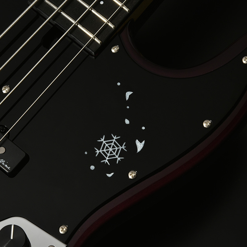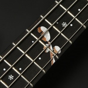 指板インレイには、桜の枝に雪が静かに積もる様子を表現し、春と冬が交わる一瞬の風景を描いています。指板材のエボニーは定番のローズウッドなどに比べて重量があり、立ち上がりが早く輪郭のあるトーンと伸びやかなサスティーンを生み出します。