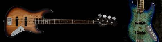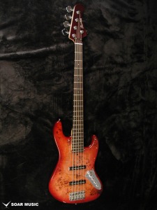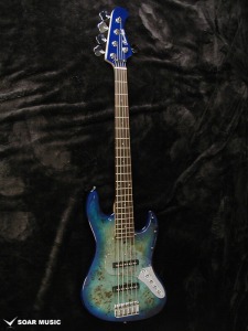 5弦ベースモデル。トップにはバールポプラ、バックにはマホガニーを使用。ポジションマークにはアバロンを採用し、高級感のある外観へと仕上がりました。ネックはメイプルとローズウッドの5Pを採用し、引き締まったサウンドへと仕上げられています。バール杢を生かすクリアピックガードを採用しています。